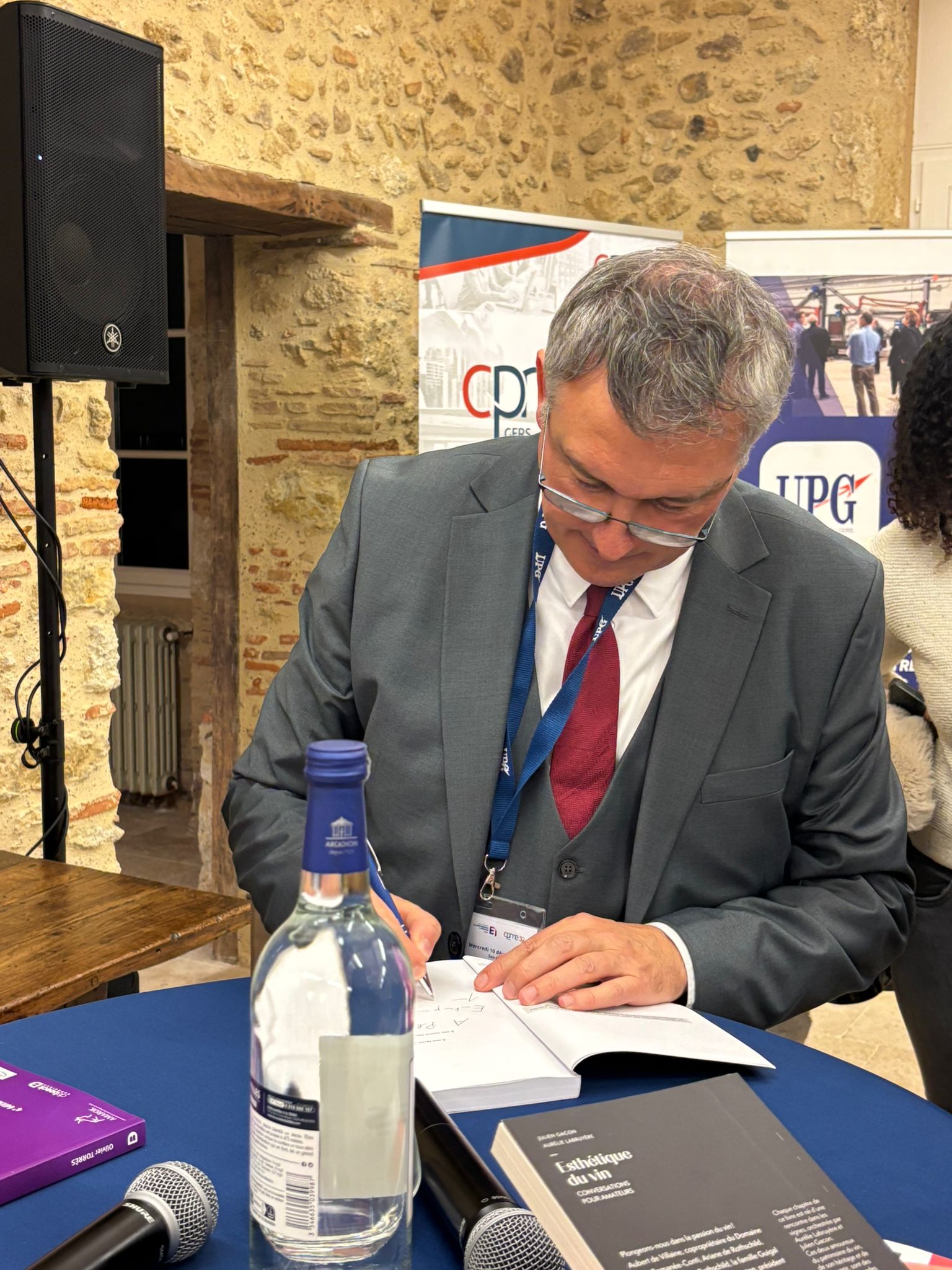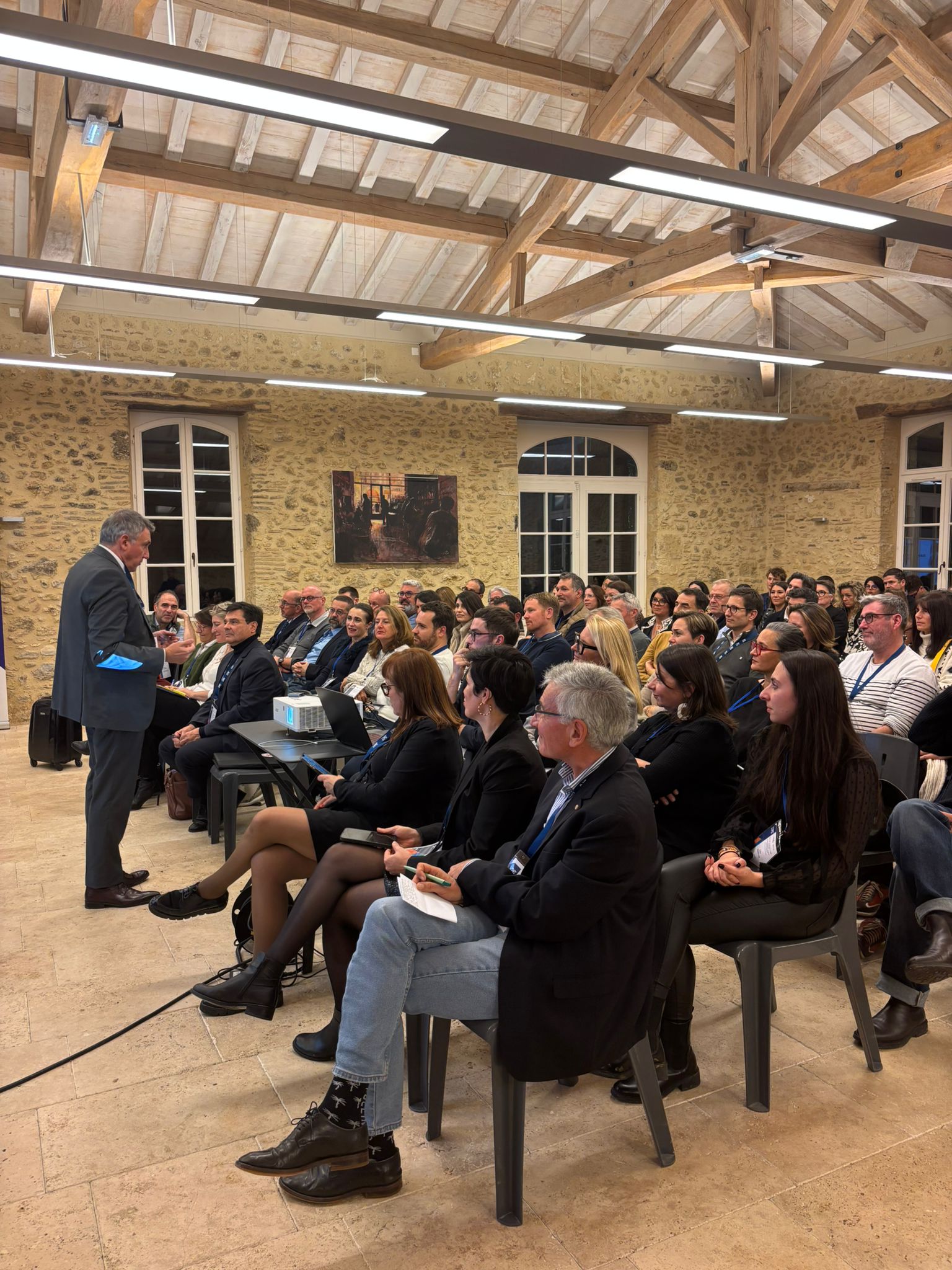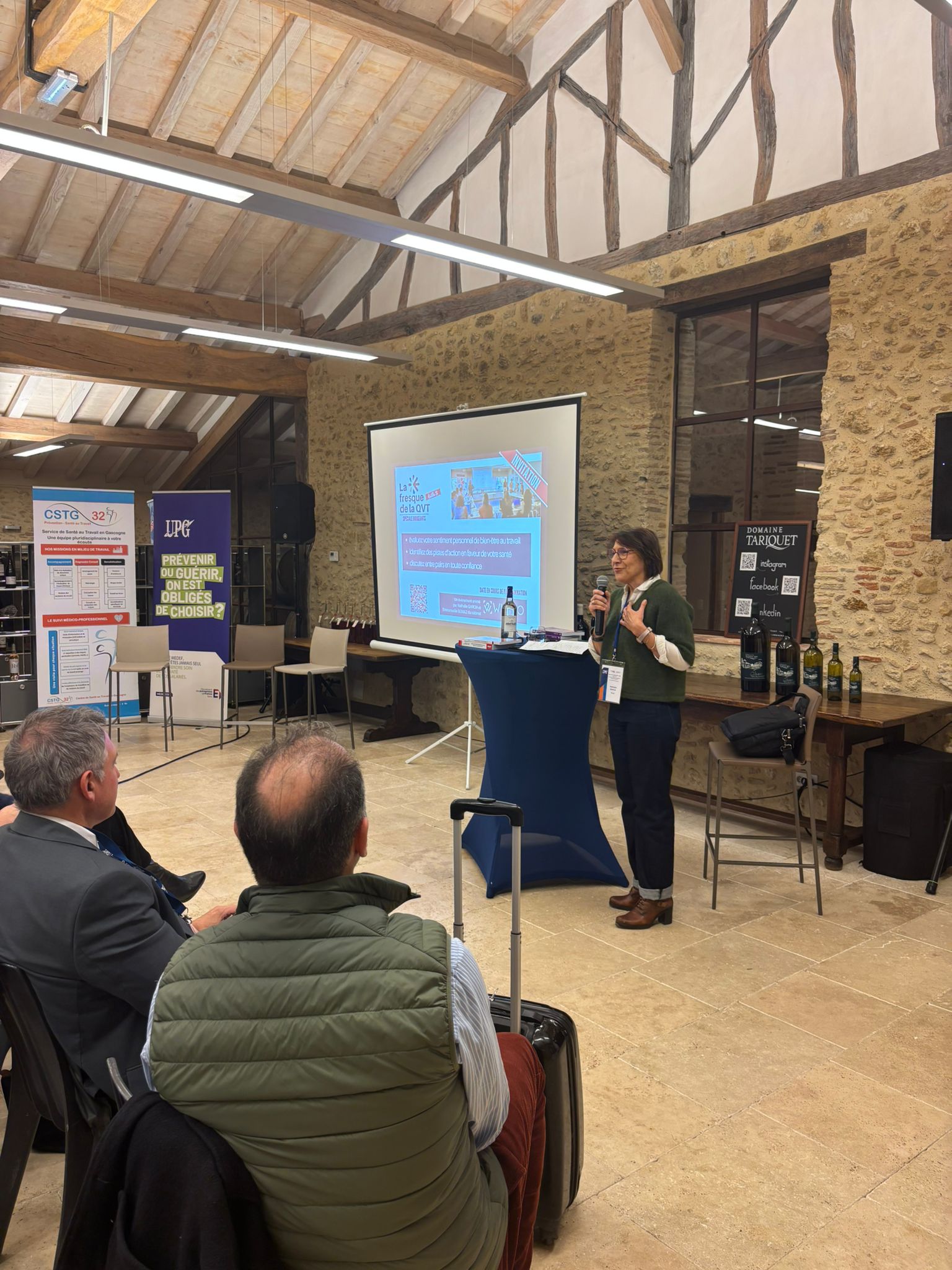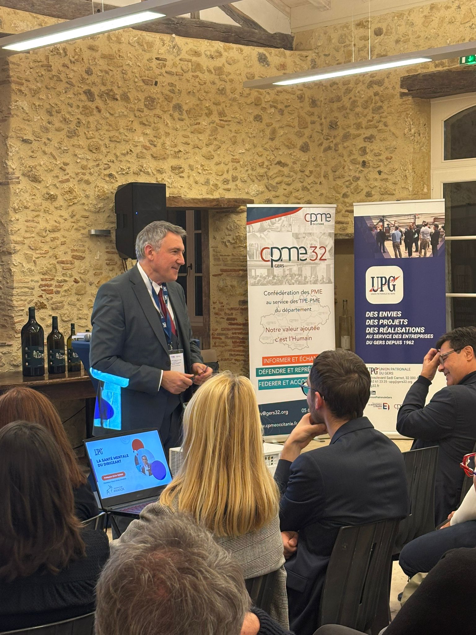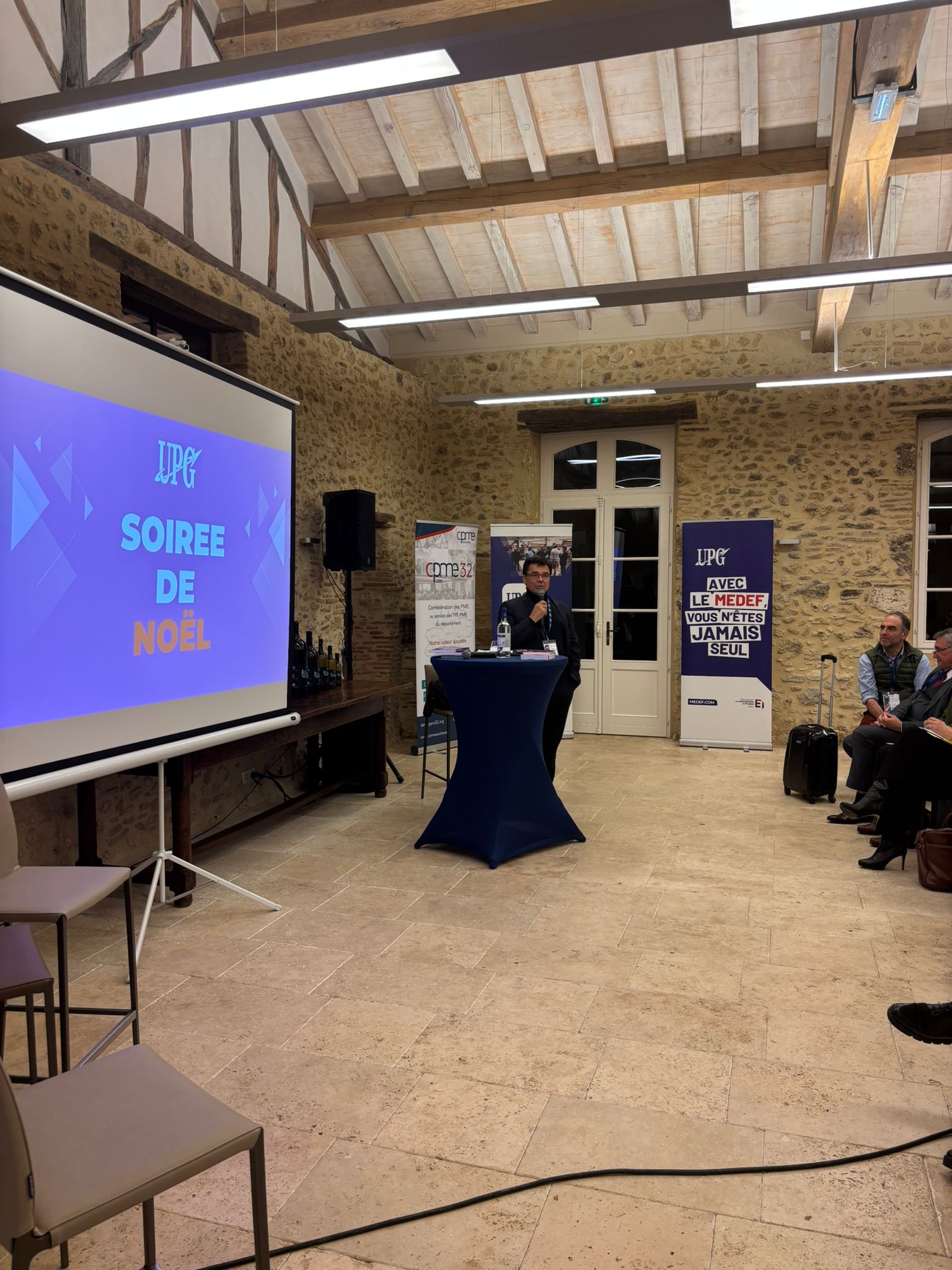 Dans ce cadre d’exception, emblématique du patrimoine et du savoir-faire gersois, la soirée a débuté par l’intervention de nos co-présidents, Philippe Lafforgue et Pierre Durand, aux côtés de notre partenaire WUNJO, cabinet QVT représenté par Nathalie Garcia.
