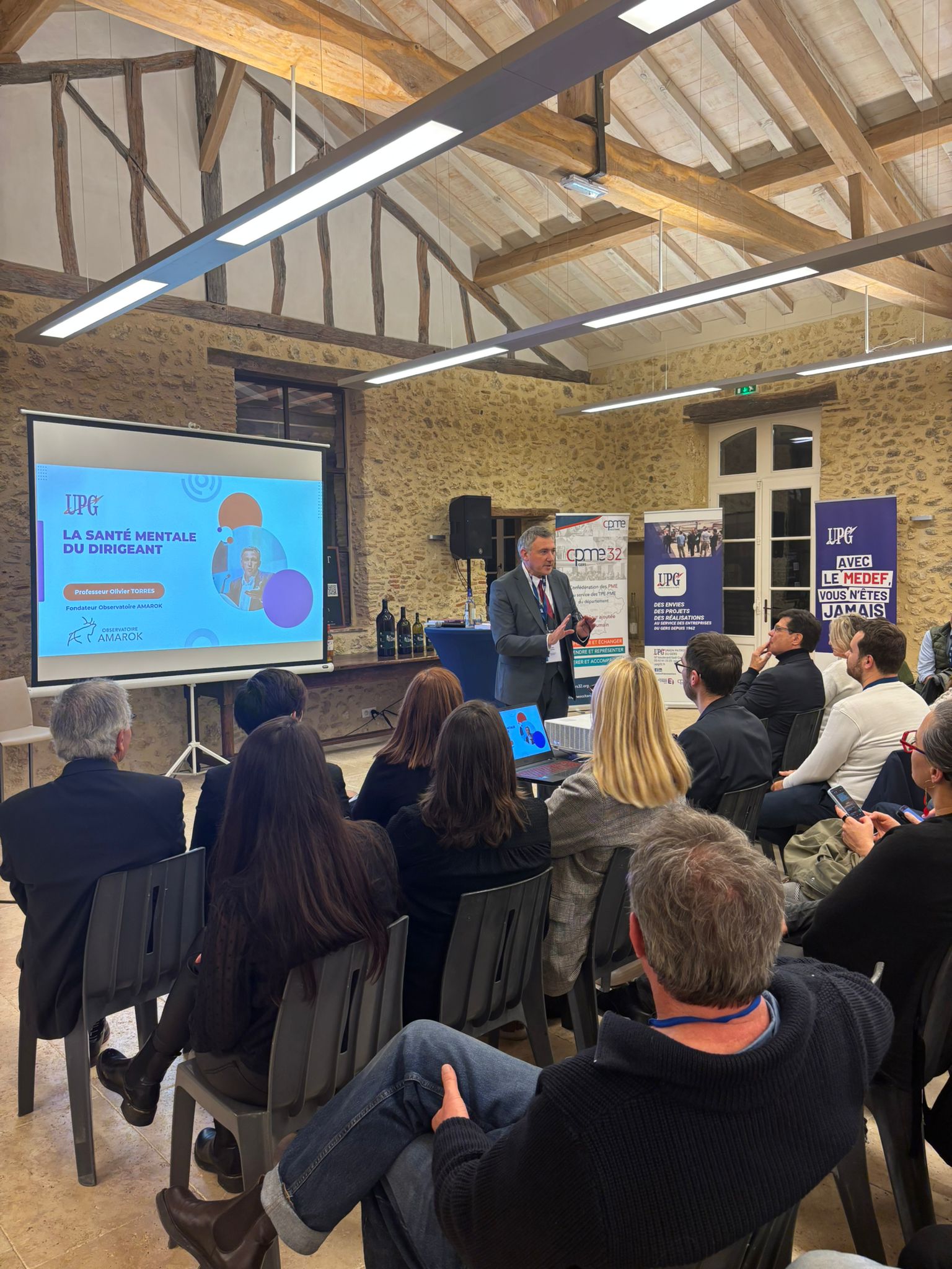 Le temps fort de la soirée fut sans aucun doute la conférence passionnante du Professeur Olivier Torres, fondateur de l’Observatoire AMAROK, autour d’un sujet essentiel : la santé mentale du dirigeant. Une intervention captivante et pleine d’humour, avec des enseignements forts.